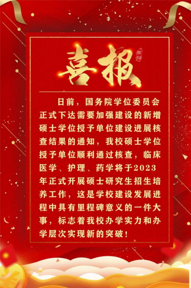 近日,据国务院学位委员会办公室下发的《关于下达需要加强建设的新增博士、硕士学位授予单位建设进展核查结果的通知》,我校顺利通过了国务院学位委员会核查,临床医学、护理与药学3个硕士专业学位授权点从2023年起开展招生和培养工作。这是学校学科建设工作的重大突破,是学校事业发展的标志性成果、历史性成就。