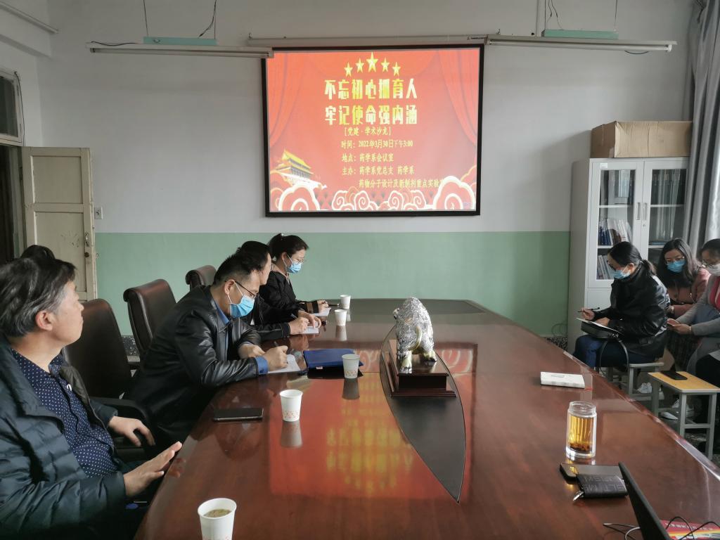 3月30日下午,药学系“不忘初心抓育人 牢记使命强内涵”党建·学术沙龙第十八期在药学系会议室举行。校党委第三巡察组成员、药学系主任宋丽华、党总支副书记李俊波、全体在职党员和2020年以来入职的青年教师参加活动。